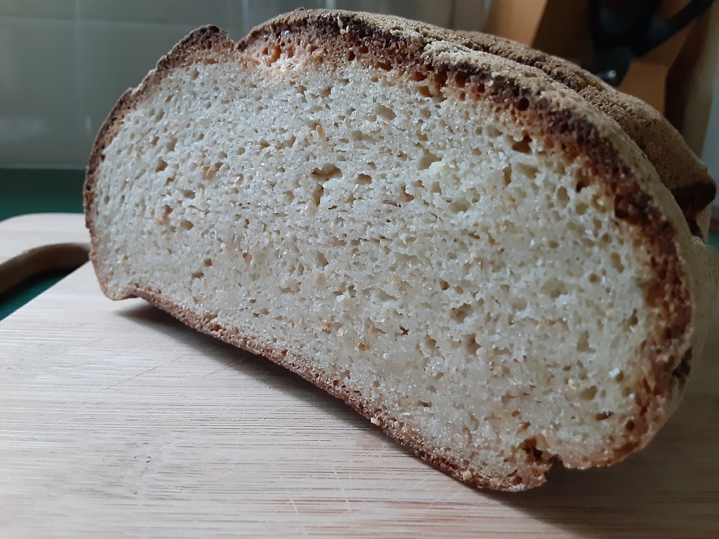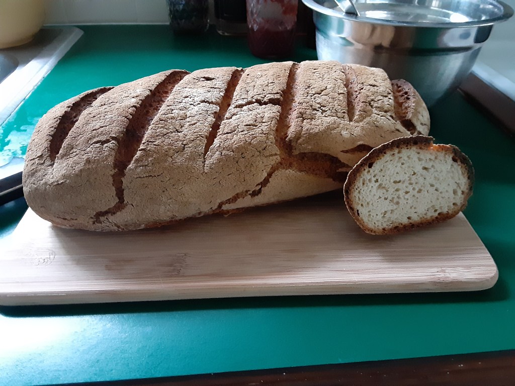 Mix water, syrup, salt, starter, and flax first. Add in flour a cup at a time. Lightly knead into a round or oblong loaf. Place loaf on a cookie sheet lined with parchment or on a silicone baking mat. Allow to rise in a warm place covered with another baking dish (near woodstove, in the oven with light on, or where it is consistently warm 70-80 degrees. On a heating pad at the medium setting works the best for me). Timing is an experiment here…8-12 hours will give you a lighter flavor, 24 hours more flavor. Your choice, but you can bake it after a single 8 hour rise. Warm oven to 450-500 degrees F, place dough in oven, and reduce temp to 400-425 for 55-60 min. Cover last 10-15 min to prevent the loaf from getting too toasted on top.